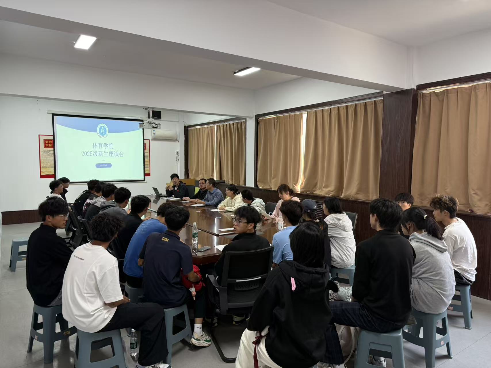 于学院楼317会议室召开了2025级新生座谈会,党委副书记李建国、辅导员李佳怿、王卫兵及各宿舍 1 名新生代表参会。