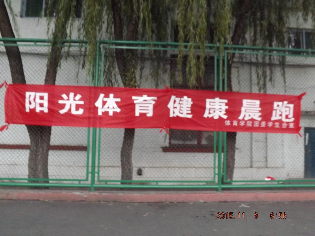 各系老师的亲切关怀下,由学生会负责人王老师带领学生会各部门成员悉心组织安排了“阳光体育,健康晨跑”早操活动。目的是为鼓励大一新生以崭新的面貌开启大学生活。