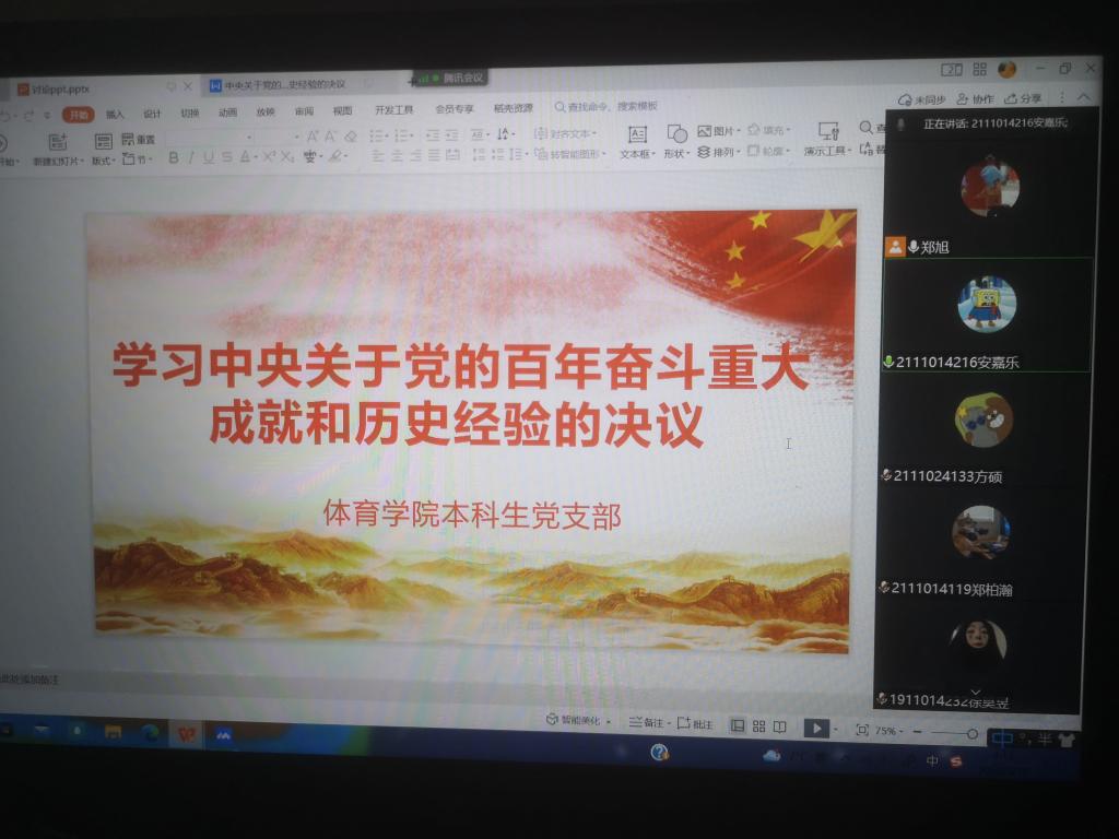 4月30日和5月1日晚间,体育学院入党积极分子以小组为单位围绕“十九届六中全会通过的《中共中央关于党的百年奋斗重大成就和历史经验的决议》”和“习近平总书记于4月25日在中国人民大学进行考察”两个主题,就学习感受进行了讨论。4月28日至5月8日期间,学员在“学习强国”平台上自行学习,累计积分。