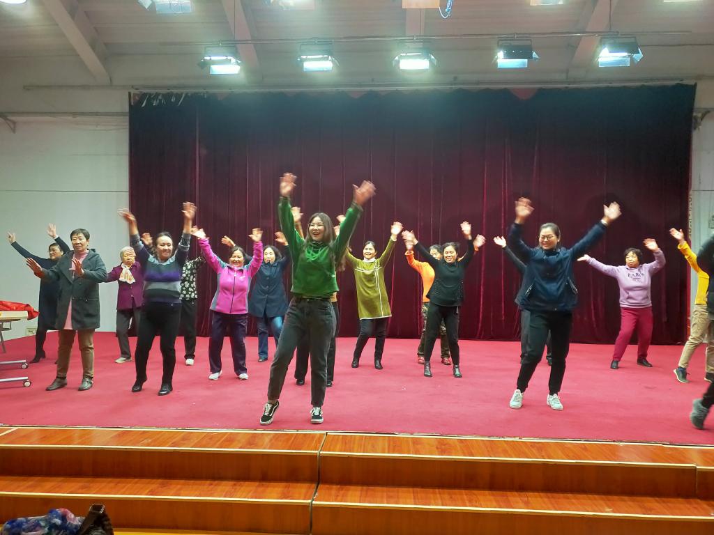 健身操专业的学生党员教授老人们《舞动中国》的健身操,让老人们在休闲中娱乐,在娱乐中健康生活。在我们党员同志专业的指导下,大家从一开始的不协调到步入正轨,身姿优雅的同时还能踩在拍子上。他们脸上的笑容以及大家的参与度就是回报给我们本次活动最好的礼物。