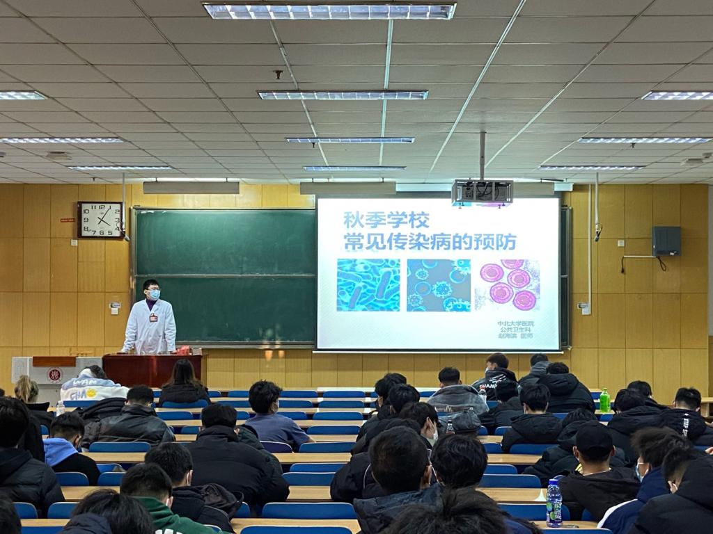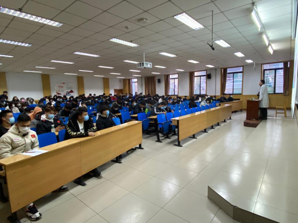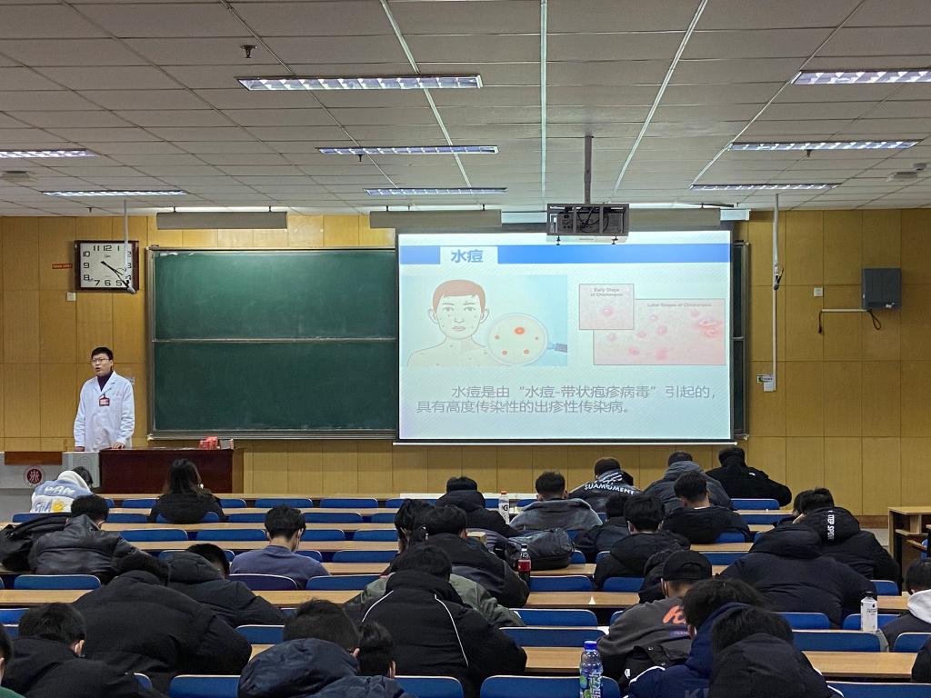 在11108H教室开展健康教育讲座。本次讲座特邀校医院赵海滨医生主讲,各年级学生代表参加,内容主要涵盖结核病及水痘的发病、传播、常见症状、预防和治疗等方面。