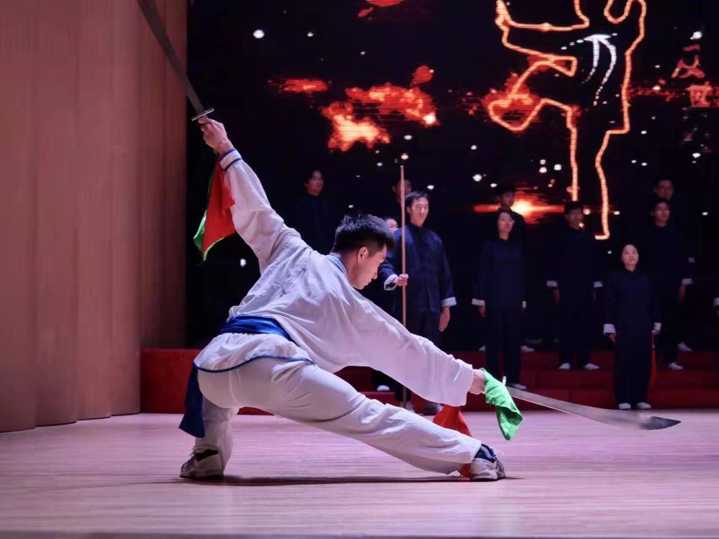 的学校体育丰硕成果。演出结束后,参加展演的领导与演员们合影留念。