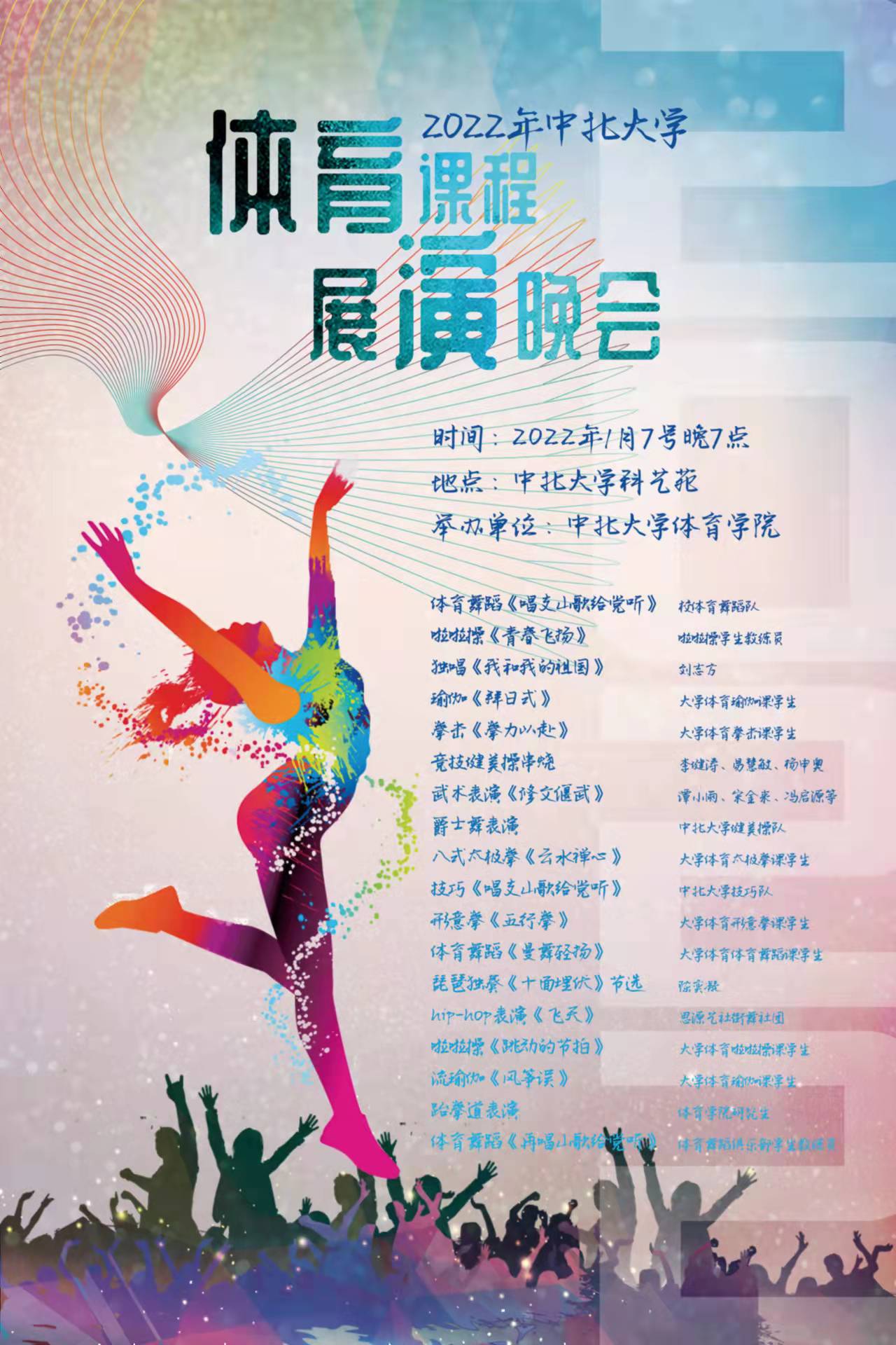 体育课程教学的稳步发展,展示体育课程的教学成果,促进大学生体育练习的积极性和参与度。整个晚会由体育舞蹈《唱支山歌给党听》、啦啦操《青春飞扬》等18个节目组成,演出时间2个半小时。演员由好色TV