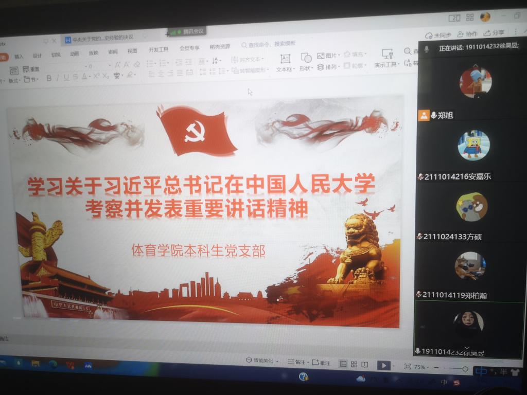 4月30日和5月1日晚间,体育学院入党积极分子以小组为单位围绕“十九届六中全会通过的《中共中央关于党的百年奋斗重大成就和历史经验的决议》”和“习近平总书记于4月25日在中国人民大学进行考察”两个主题,就学习感受进行了讨论。4月28日至5月8日期间,学员在“学习强国”平台上自行学习,累计积分。