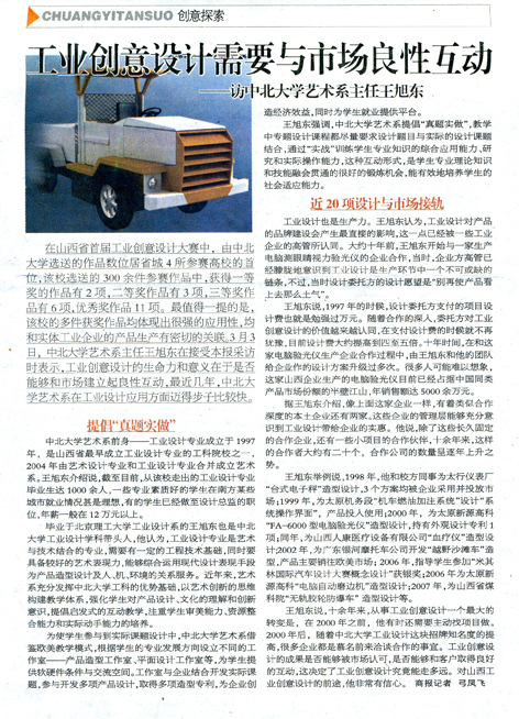 工业设计这块招牌知名度的提高,很多企业都是慕名前来洽谈合作的事宜。工业创意设计的成果是否能够被市场认可,是否能够和客户取得良好的互动,这决定了工业创意设计究竟能走多远。对山西工业创意设计的前途,他非常有信心。商报记者 弓凤飞