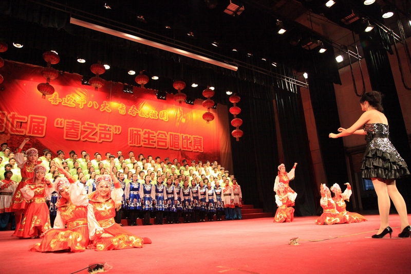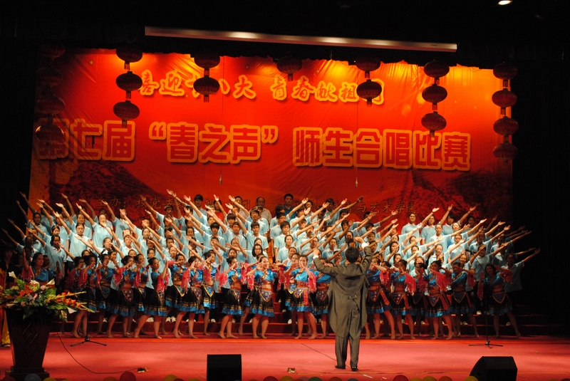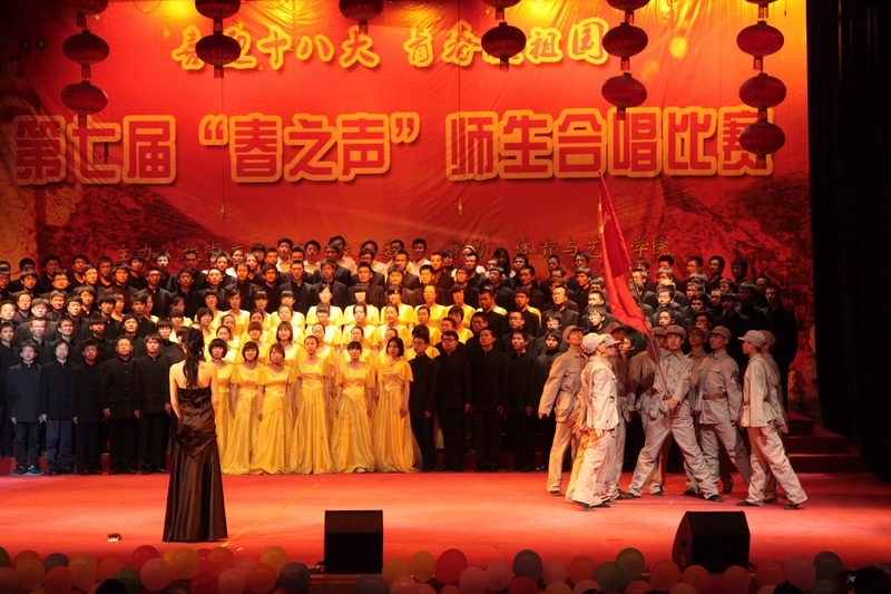 师生团结合作、乐观向上的精神面貌,为此在 5月18日晚7:00,由校党委组织部、校团委主办,体育与艺术学院承办的“喜迎十八大,青春献祖国”师生合唱比赛在科艺苑隆重举行。