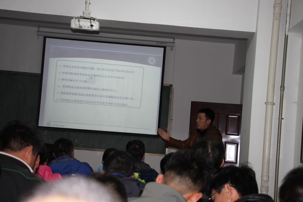 举办了“2015届本科毕业论文(设计)指导会”。教学副院长吴剑、社会体育指导与管理专业学科部副主任宿继光、理论教研室负责人耿延敏、2015届本科毕业生指导教师等参加了会议。会议由吴剑主持、耿延敏作了汇报。
