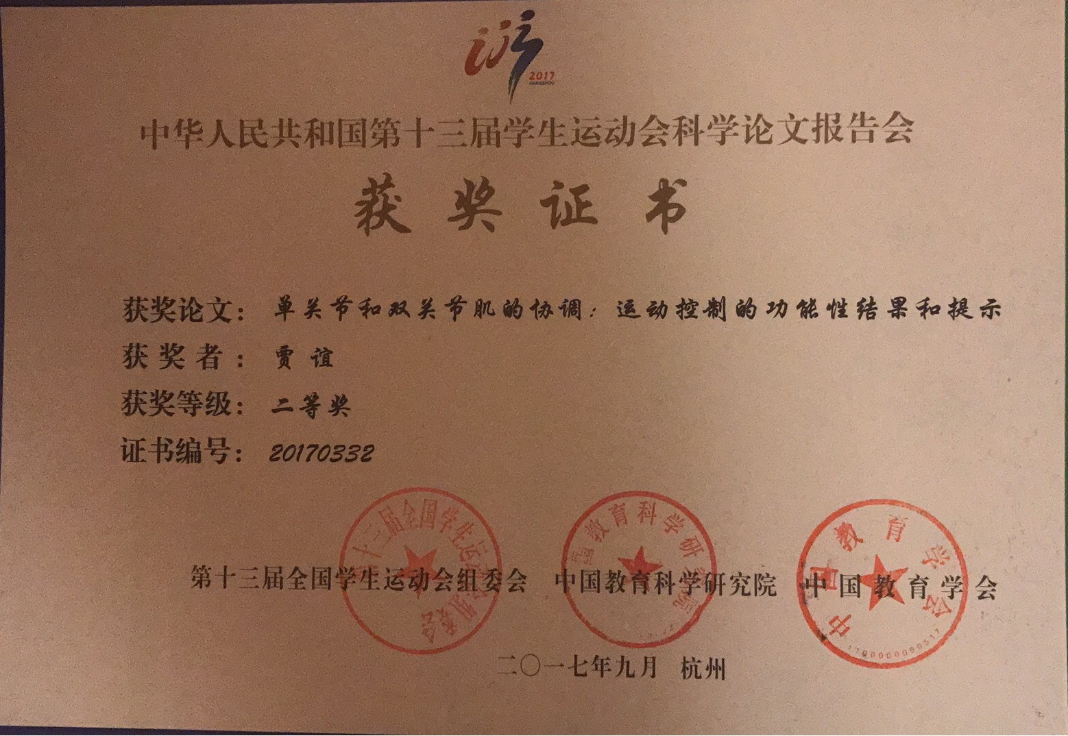 9月1日-3日,由教育部、国家体育总局、共青团中央主办,浙江省人民政府承办,中国教育科学研究院、中国教育学会全国高等学校体育教学指导委员会、全国中小学体育教学指导委员会协办的第十三届全国学生运动会科学论文报告会在浙江工商大学举办。